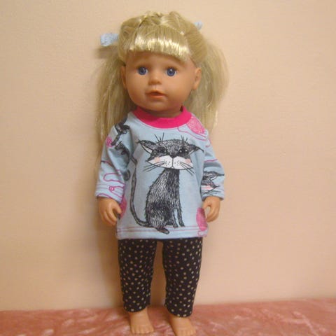 43 cm nukelle (baby born tai sister) trikoosta kuviollinen paita, jossa takana pukemista helpottava tarrakiinnitys. Housuissa vyötäröllä kuminauha.