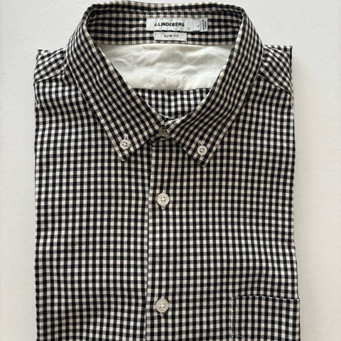 J. Lindeberg miesten lyhythihainen kauluspaita, koko L. Paita on slim fit -mallia ja valmistettu 100 % puuvillasta. Kuosina on ruutukuvio vaalealla pohjalla. Kangas on hieman paksumpaa puuvillaa.