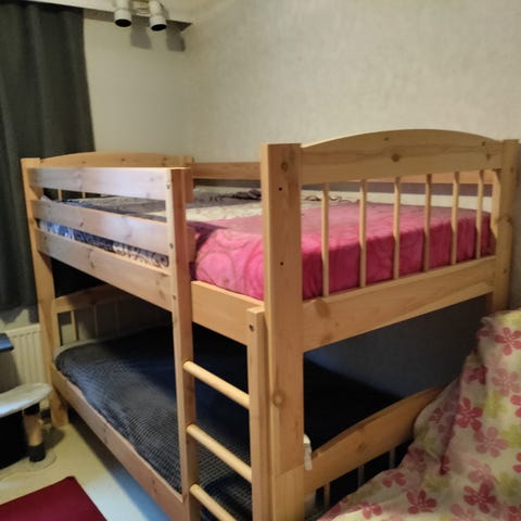 Harmaa kerrossänky. Saa myös kahdeksi eri sängyksi. Sälepohja. Patjat ei kuulu kauppaan.