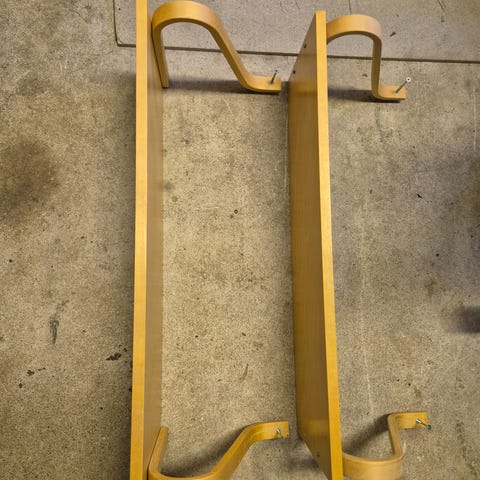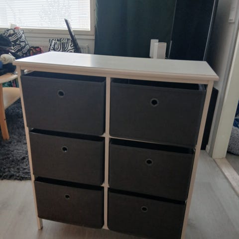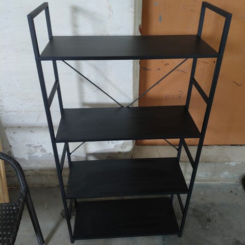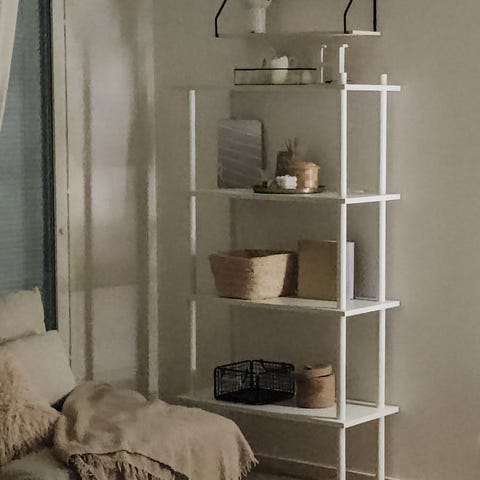Vaalea, kapea hyllykkö, jossa on useita avoimia hyllytasoja. Sopii esimerkiksi kirjojen, koriste-esineiden tai pienten säilytyskorien säilytykseen.