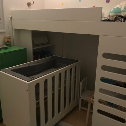 Hyväkuntoinen ja laadukas Stompa Uno 4 valkoinen parvisänky lapselle. Sänky on ostettu uutena Juurikivi kalusteelta, ovh 1100€. Sängyssä on tikkaat, laidat molemmilla sivuilla sekä pieni hylly kirjoille tai mukille. Patja lepää puisella sälepohjalla. Parvisängyn alla on sängylle mitoitetut säilytystilat: lokerikot sekä lipasto (erilliset kuvat). Sopii siis pienempäänkin lastenhuoneeseen. Voidaan myydä kokonaisuutena tai tarvittaessa ilman erillisiä säilytysratkaisuja.