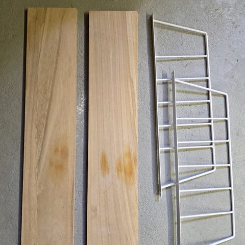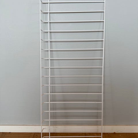 String-järjestelmään lehtihylly, valkoista lankamallin metallia. Soveltuu String-järjestelmän osaksi seinähyllyksi tai säilytyshyllyksi. Metallinen ritilärakenne, joka kiinnittyy String-sivupaneeleihin. Sopii esimerkiksi lehtien tai pienten taideteosten tai esitteiden esittelyyn.