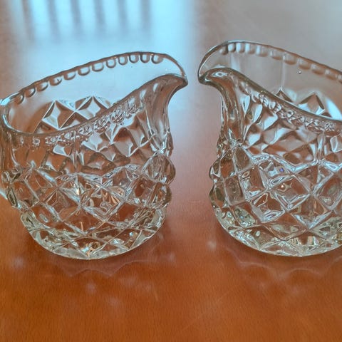 Riihimäen/Mäntyharjun lasin Klara-sarjan kaunis kermakko ja sokerikko.