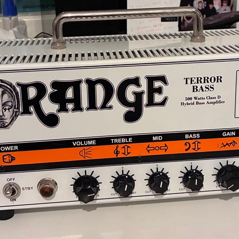 Orange full stack : vahvistin 500w terror bass, 4x10 kaappi ja 1x15 alakaappi.