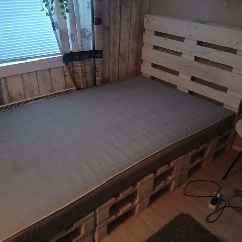 Myydään muuton alta 120 cm leveä runkopatjasänky. Sänky on tyypiltään aika pehmeä ja siinä on tyylikkäät puiset kaarijalat.