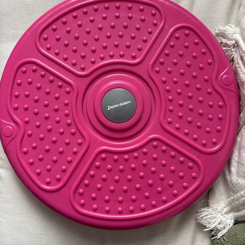 Ego Fit tasapainolauta. Pyöreä, valkoinen lauta, jossa kohokuvioitu pinta ja nystyrät jalkapohjien alla. Soveltuu tasapainoharjoitteluun, kehonhallinnan kehittämiseen ja jalkojen aktivointiin esimerkiksi seistessä.