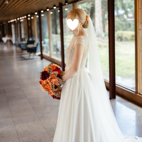 Morsiuspuku + vannehame, koko 36. Vyötärömitta saumasta saumaan 32 cm. Kunto muuten erinomainen, mutta takaa laahuksen päältä ei pesulassa lähtenyt lika. Lika ei näy mitenkään erityisen hyvin, mutta jos haluaa priimaa, niin helma on takaa pidempi, joten siitä on varaa ottaa vähän pois. Pukua saa sovittaa joko Keravalla tai Sipoon Nikkilässä.
