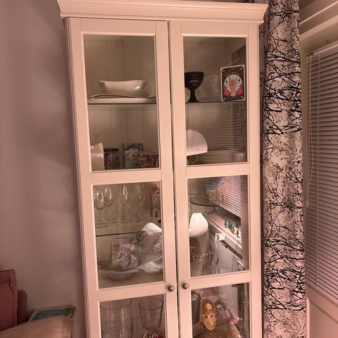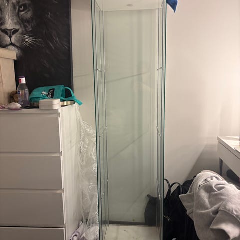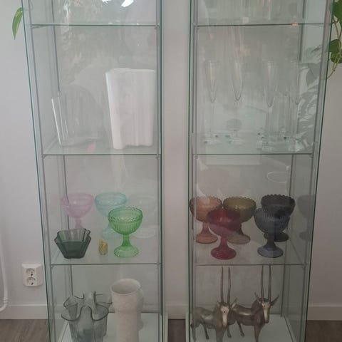 Kompaktin kokoinen lasivitriini. Toisessa sivussa paperi/liimajälkeä. Muuten ok kuntoinen. Noutp