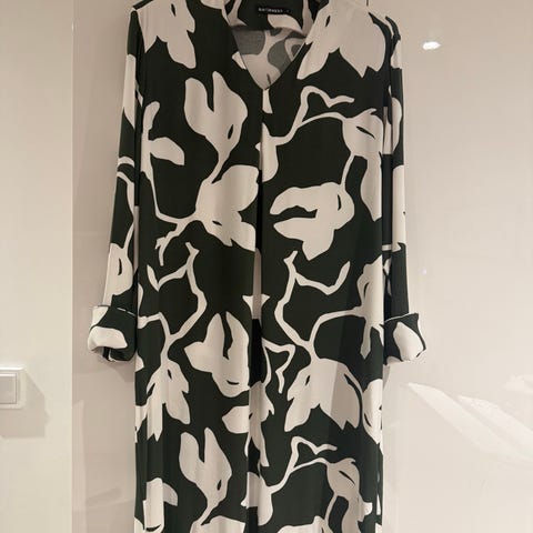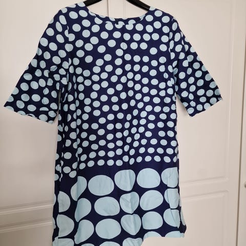 Marimekko Hester naisten mekko, koko 42. Mekossa on suoralinjainen malli ja pitkät hihat. Päämateriaalina on puuvilla, mukana pieni määrä elastaania joustavuuden lisäämiseksi. Vuori on polyesteriä ja elastaania. Mekossa on leveä vaakasuora kontrastiraita keskiosassa. Sopii arki- ja juhlakäyttöön. Väri on tumma, kaksivärinen kokonaisuus.