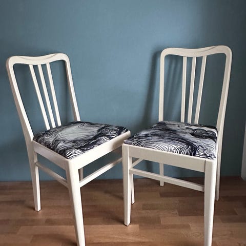 Klassikkomalli 50-luvulta, runko koivua ja vaneria. Istuin pehmustettu ja verhoiltu. Kaikki uudistettu- hiottu, maalattu Helmi- kalustemaalilla, uusi pehmuste ja verhoilukangas kestävää markiisia ”simpukka”-kuosi, kotimaiselta merkiltä.(jonka nimeä ei saa mainita) huopatassut myös vaihdettu. Hyvät ja tukevat tuolit, hieman erilaiset keskenään. Myydään parina yhteensä 50€. Nouto Meilahti. Katso myös muut ilmoitukseni : ).