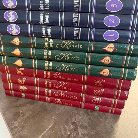 Kirjasarja todella hyvässä kunnossa. Ainoastaan 1 osan paperi päällysteessä kulumaa ja pieni reikä. Itse kirjat ovat ehyet ja lähes koskemattomat.