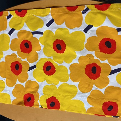 Marimekon Unikko kankaasta ommeltu kappa. Pituus on n. 146 cm, korkeus n, 62 cm ja Tankokuja n. 7 cm. Käyttämätön. Ei toridiiliä käytössä. Lähetys 6.50 euroa Matkahuollon paketilla.