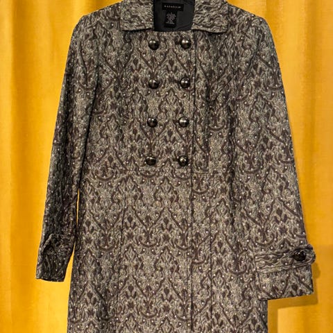 Tummansininen, trumpettihihainen (3/4) takki/jakku (L) on uusi eli täysin käyttämätön. Takissa on yhä laput kiinni. Kyseistä vaatetta voi käyttää siis joko takkina tai pitkänä jakkuna.