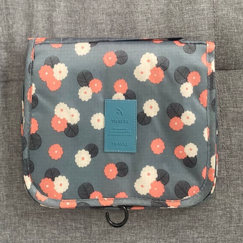 Vaaleanpunainen ripustettava toilettilaukku. Laukku voidaan taittaa kasaan ja ripustaa koukusta esimerkiksi kylpyhuoneeseen tai matkoilla käyttöä varten.