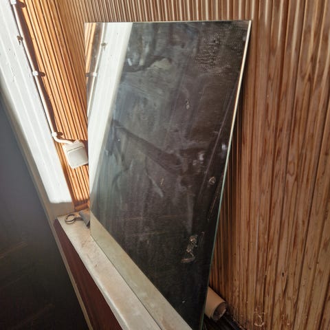 Peili metallikehyksellä. Peilissä on suorakulmainen muoto ja leveä, niiteillä koristeltu metallinen kehys, joka antaa teollishenkisen ilmeen. Taustapuolella on tukeva rakenne seinäkiinnitystä varten. Soveltuu käytettäväksi esimerkiksi eteisessä, makuuhuoneessa tai muussa sisätilassa kokovartalo- tai asustepeilinä.