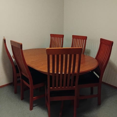 Hyväkuntoinen vaalea puupöytä. Tuolien selkänojissa yksittäisiä käytön jälkiä