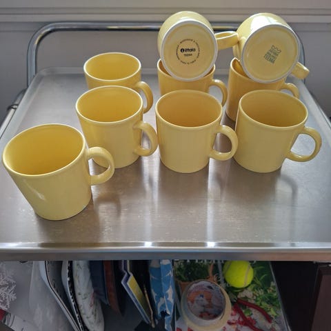 Kaksi harmaata ja kolme sinistä teema mukia. Siistit ja ehjät. Suomessa valmistettu.