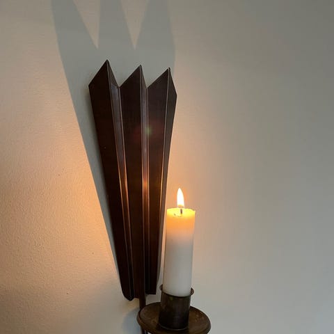 Messinkinen seinälle kiinnitettävät kynttilä lampetti Vintage. Korkeus 21 cm, leveys 7,5 cm ja ulkoneva seinästä 10cm. Lampetteja on enää 1 yksi kappale jäljellä.