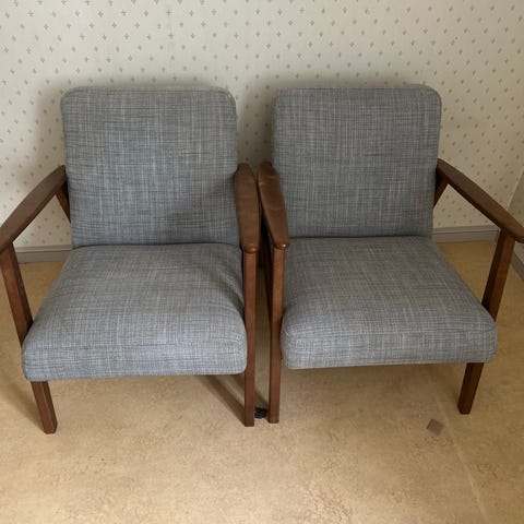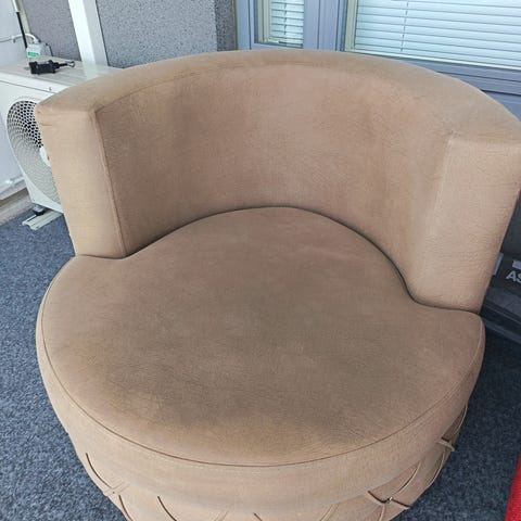 Annetaan vihreä nojatuoli. Ehjä, mutta kangas osittain haalistunut ja kissakin vähän raapinut. Uudelleen verhoiltuna varmasti vielä kelpo tuoli. Vain nouto.