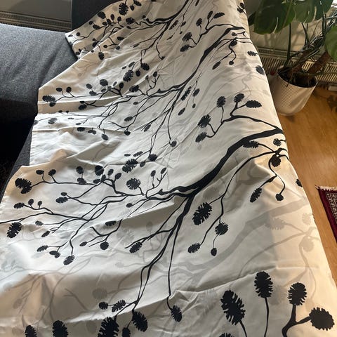 Kaksi IKEAn punaruskeaa verhokangasta. Tai ainakin luulen IKEAksi, mutta en tarkalleen muista, mistä ostettu. Oli käytössä n. 2019-2024, mutta muuton jälkeen ei ole löytynyt vuoteen käyttöä, vaan on lojunut vaatehuoneessa.