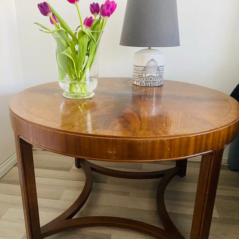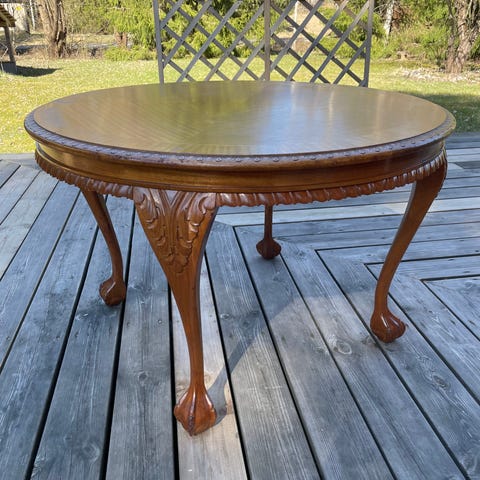 Ruskea puinen pyöreä pöytä tuunattavaksi. Vaatii laittoa, mutta tuunaamalla saa hyvän.