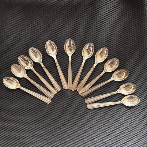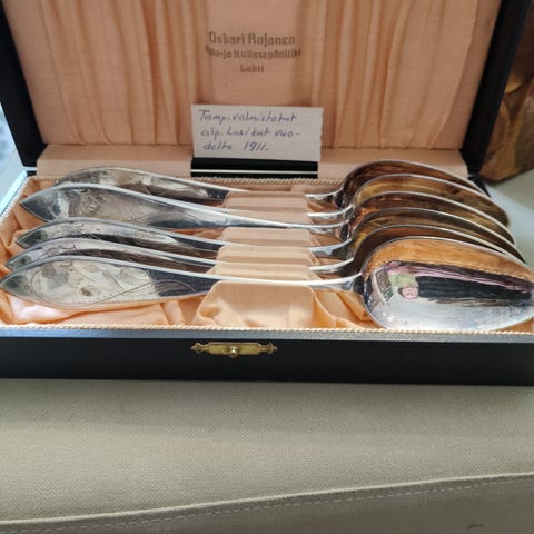 Hopeiset ruokalusikat 1950-60 luvulta, yhteensä 6 kappaletta. Lusikoissa on varressa kaiverrukset ja leimat, jotka kertovat hopeapitoisuudesta. Hopealeimassa merkintä 916H eli pitoisuus suurempi kuin nykyään. Elekrolyyttisesti puhdistetut. Paino yhteensä 164 g. OVH min 230 €