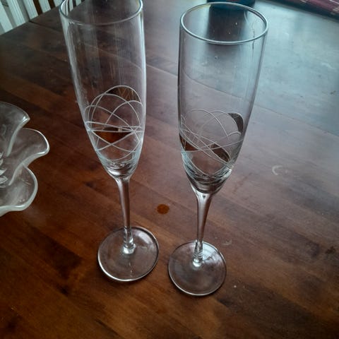 Kaksi samppanjalasia, joissa on kaiverrettu koristekuvio. Korkeat, kapeat lasit sopivat kuohuviinille tai samppanjalle. Läpinäkyvä lasimateriaali ja jalallinen malli. Sopii esim. Kihla- tai hääparille.