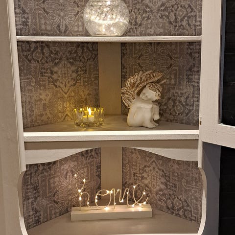 Valkoisen rouheaksi, kuluneeksi maalattu kulmakaappi. Anopin peruja, eli ikää on.