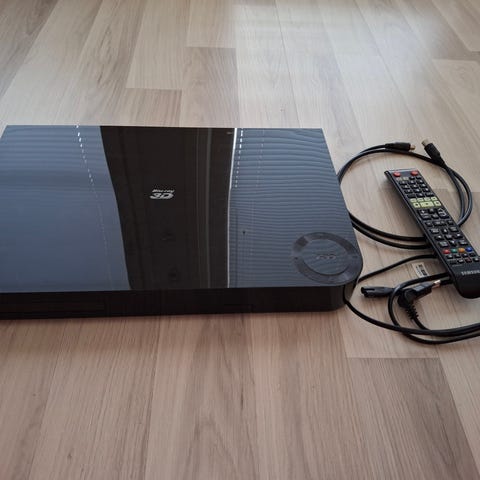 Toimiva Samsung Blu-ray/DVD-soitin (malli BD-F5100). Lukee Blu-ray- ja DVD-levyt nopeasti. Kuori on hyvässä kunnossa, mutta pinnassa näkyy käytön jälkiä. Mukana alkuperäinen kaukosäädin.