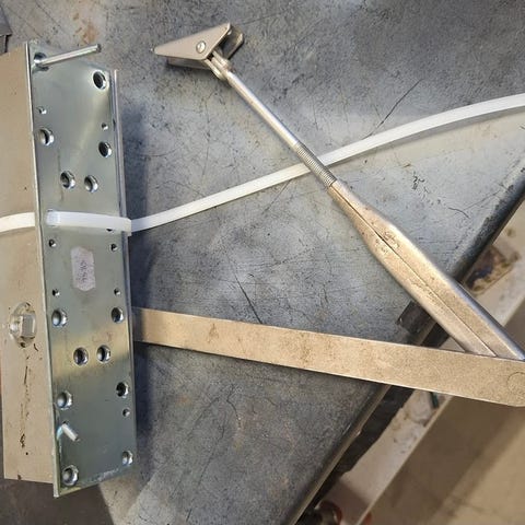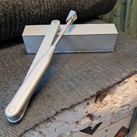 Kuvan mukainen ovipumppu. Vetovarsi jatkettu hitsaamalla. Toki sitä voi myös lyhentää.