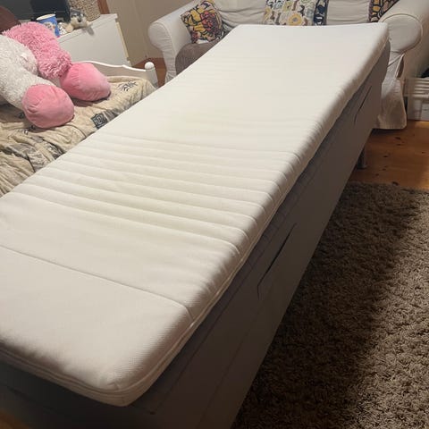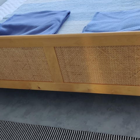 Verhoiltu parisänky, jossa korkea pääty ja jalkopääty. Pääty ja jalkopääty ovat vaaleanpunaista, napitettua verhoilua ja niissä on koristeelliset kehykset. Sänkyyn kuuluu kaksi erillistä patjaa. Sopii kahden hengen nukkumiseen makuuhuoneeseen.