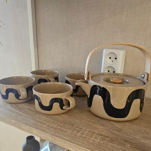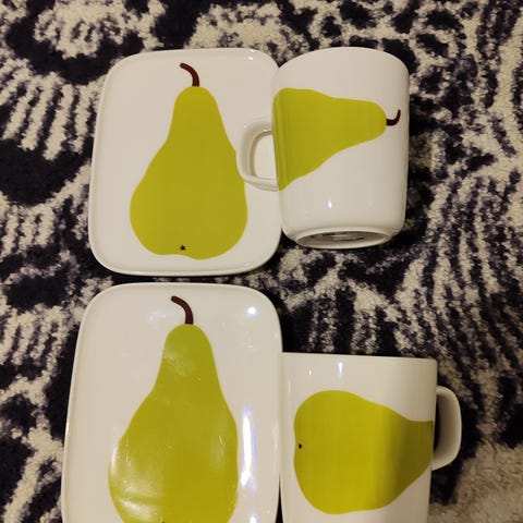 Myydään Marimekon oiva päärynä kahvikupit ja lautaset. 6kpl kahvikuppeja ja lautasia. Ehjät ja siistit.