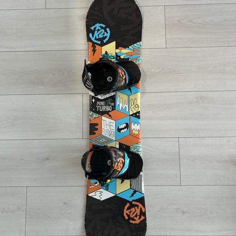 K2 Mini Turbo lasten lumilauta, K2 miniturbo siteillä. Laudan pohjassa ja kannessa on monivärinen graafinen kuosi, jossa on eläinhahmoja ja K2-logo. Siteet ovat säädettävät ja soveltuvat lasten lumilautakenkiin. Laudassa on twintip-muoto, joka mahdollistaa ajon molempiin suuntiin. Reunoissa ja pinnassa on käytön jälkiä ja naarmuja, jotka näkyvät kuvissa. Sopii lasten lasketteluun rinteissä ja harjoitteluun lumilautailun alkeissa.