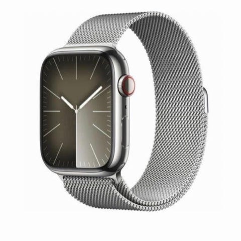 Apple Watch älykello mustalla rannekkeella. Kellossa on suorakaiteen muotoinen kosketusnäyttö ja se toimitetaan magneettisen latauskaapelin kanssa. Sopii käytettäväksi iPhonen kanssa esimerkiksi ilmoitusten seurantaan, aktiivisuuden ja harjoitusten seuraamiseen sekä perustoimintoihin, kuten ajan ja herätysten näyttämiseen.