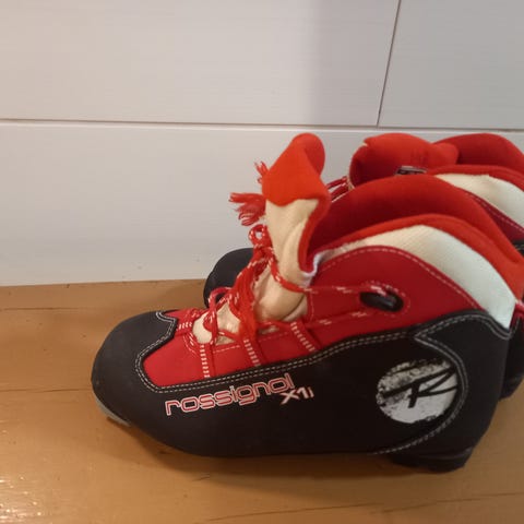 Rossignol X1 hiihtomonot. Väri punainen/musta, nauhakiinnitys ja nilkkaa tukeva varsi. Pohjassa uritettu kumipohja, joka sopii perinteisen tyylin siteisiin (NNN-yhteensopiva pohja). Soveltuu maastohiihtoon.