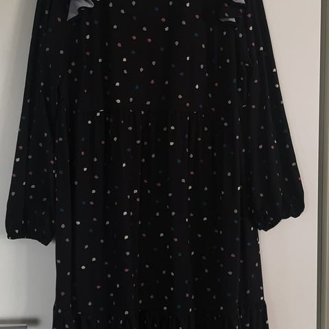 Uudenveroinen Esmaran mustavalkoinen pilkullinen mekko, pääntiessä röyhelö ja solmimisnauhat, hihansuissa kuminauharypytys, koko 46, pituus 128cm, kainalo-kainalo-mitta 60cm.