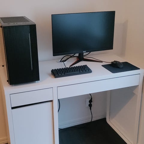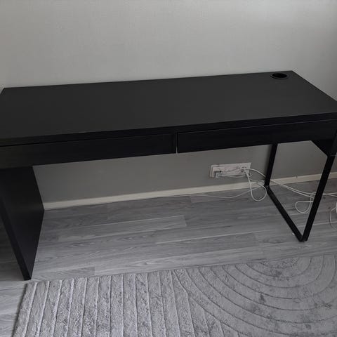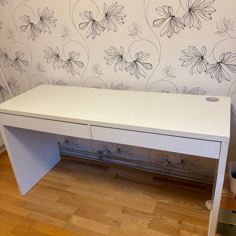 Ikea malm työpöytä ulos vedettävällä tasolla. Tason puolen voi päättää itse.