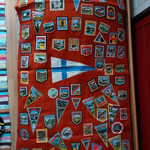 Kangasmerkit. Olleet vain hakaneulalla retkeilyauton verhoilussa kiinni. Siistikuntoiset.