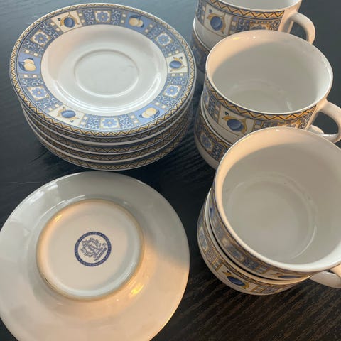 Siisti, lähinnä kaapissa lojunut astiasto. Kaikkia muita 8kpl, mutta leipälautasia 7kpl. Sokerikko ja kermakko.