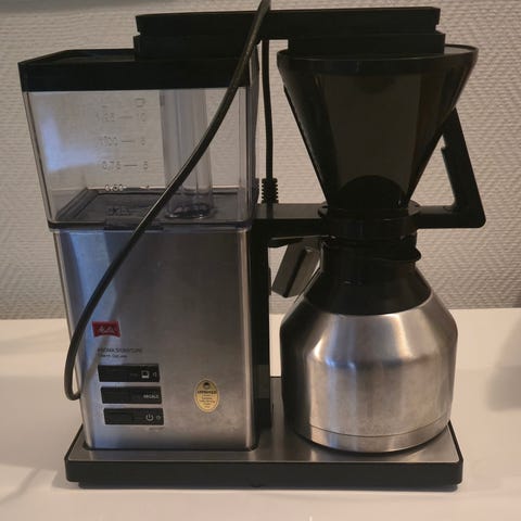 Joitakin vuosia vanha, vähäiselle käytölle jäänyt Melitta Look kahvinkeitin termoskannulla. Keittää jopa 15 kuppia kahvia! Kahvin vahvuutta voi säätää laitteen päällä olevasta säätimestä. Automaattinen kalkinpoistomuistutus.