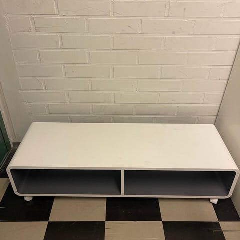 Myydään tyylikäs valkoinen TV-taso, jossa kaksi harmaata laatikkoa. Korkeakiiltoinen pinta antaa huolitellun ja modernin ilmeen.