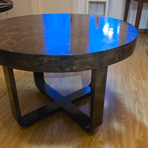 Ihana ja kaunis pöytä, jossa pieniä elämisen jälkiä jo. Kansi kaipaisi käsittelyn.