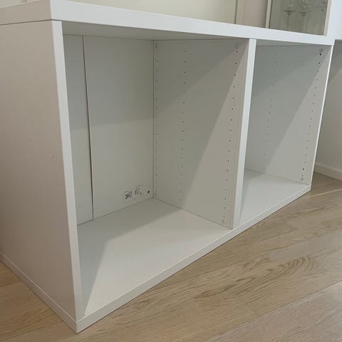Ikean Bestå sarjan laatikoita kiskoilla kahdet. Värinä valkoinen.