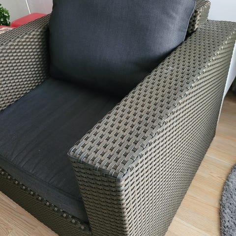 Lasitetulla parvekkeella olleet rottinkikalusteet, sohva ja tuoli. Muuton alta pois, suoraan käytöstä ja täysin toimivat. Sohva 130x65.