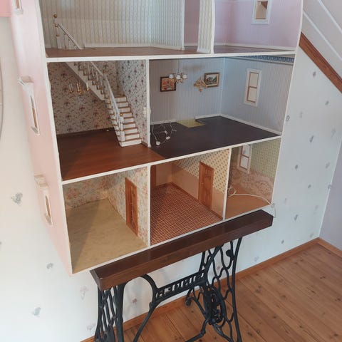Paljon leikitty, mutta edelleen toimivassa kunnossa oleva vaaleanpunainen nukkekoti. Useita kerroksia ja avattavat etuovet. Talossa on useita huoneita, kuten makuuhuone, olohuone ja kylpyhuone. Mukana tulee puisia kalusteita, kuten sänky, tuoleja, pöytiä, lipasto ja kylpyamme.Nukkekoti soveltuu leikkeihin pienille nukeille tai figuureille sisäkäyttöön.
