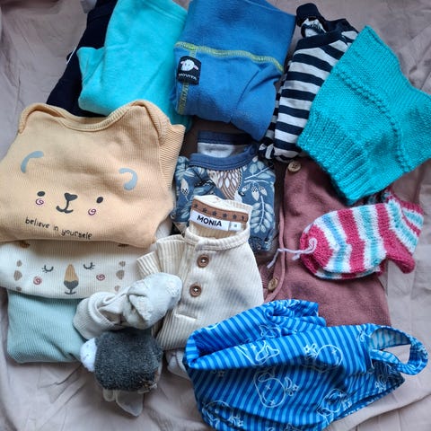 Vaatesetti vauvalle koko 68-74. Hyväkuntoisia vaatteita. Haalari on lyhyt hihainen ja lahkeiden. Neuletakki kuuluu settiin.