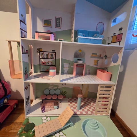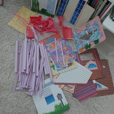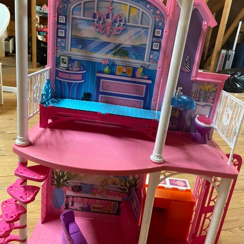 Myydään seuraavalle leikkijälle kuvassa näkyvä barbitalo tavaroineen (pöytä, tuoli, kylpyamme ja sohvan). Talon saa kasaan, joten helppo säilyttää.