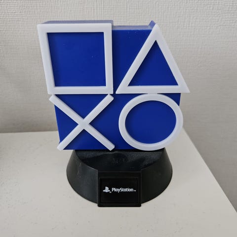 PlayStation seinävalo, jossa PlayStation-ohjaimesta tutut symbolit: neliö, kolmio, risti ja ympyrä. Monivärinen LED-valaistus, joka hehkuu vihreän, sinisen, punaisen ja violetin sävyissä. Sopii esimerkiksi pelihuoneen tai olohuoneen tunnelmavaloksi ja koristeeksi. Valaisin on tarkoitettu sisäkäyttöön.