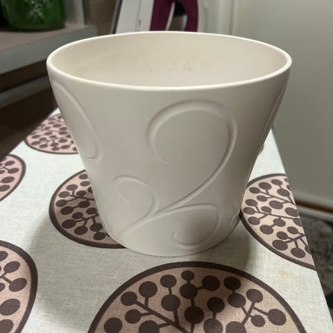 Neliönmuotoinen ruukku, valkoinen, pinnassa kohokuvio. Soveltuu esimerkiksi huonekasville suojaruukuksi (ei reikää pohjassa) tai säilytysastiaksi. Materiaali keraaminen tai vastaava, kova ja lasitettu pinta ulkopuolella. Koko 16 x 16 ja kork. 15 cm. Vain nouto Turusta.
