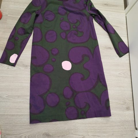 Marimekon rento mekko, polvipituinen tai hieman sen alle ulottuva, pitkät hihat ja pyöreä pääntie. Voi käyttä joko vyöllä tai ilman. Siisti!